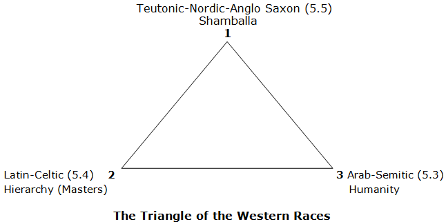 occidental de hoy, que se puede generalizar de la siguiente manera: 3. Los Teutones, los Escandinavos y los Anglo-Sajones, quienes son los descendientes del tercero de estos discípulos."[9] [Quinta sub-raza 5.5] Los estudiantes podrían observar que de los Teutones, los Latinos y los grupos Semitas - representan, respectivamente, los tres primeros “aspectos” de voluntad, amor e inteligencia. De ahí que la fuerza de Shamballa de primer rayo está expresándose muy fuertemente la raíz Europea del norte de las razas Occidentales. Por lo tanto el punto de menor resistencia (como el mencionado con anterioridad China), es el uso de la fuerza (voluntad) sin misericordia (amor).
