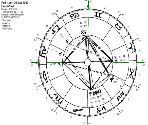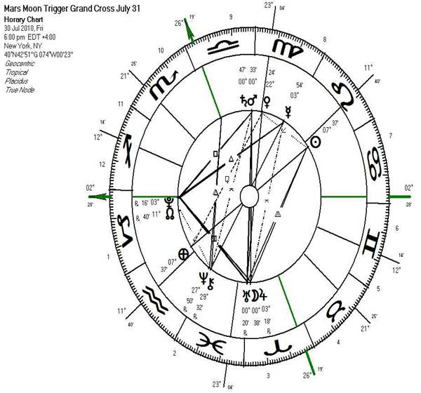 de Câncer: Londres 26 de junho de 2010. Esse mapa apresenta aspectos de desafio, não somente porque existem forças em desarmonia, mas por causa da ‘guerra’ que há entre Saturno e Urano. Esses dois planetas têm estado ‘dançando’ em oposição há algum tempo e criando uma atração entre o que é conhecido (o passado) e o que é novo (o futuro). O revolucionário Urano entrou em Áries pela primeira vez desde de 84 anos e também é o regente hierárquico deste signo. [3] Urano promove novas ideias e grande inovações, principalmente neste momento, porque está em conjunção com Júpiter, que é expansivo e expansor. Júpiter, em seu ciclo de 12 anos, traz possibilidades de expansão, muito além do que se pode imaginar, mas Saturno em Virgem está em oposição a Urano, e Saturno é o planeta que traz restrição e que procura manter o passado. Além disso, Saturno está para voltar para Libra (21 de julho), que é o signo que ele rege hierarquicamente e onde é exaltado. As novas medidas de austeridade orçamentária que estão sendo discutidas na Inglaterra são características clássicas de Saturno em Virgem. Atravessando (cruzando) essa oposição, está a oposição natural do sol e da lua na hora da lua cheia, e esta oposição é acrescentada por Plutão, que está no mesmo grau da lua e Mercúrio em conjunção com o sol. Toda a configuração sugere possibilidades surpreendentes de transformação em nível individual e universal, embora em muitos aspectos seja bastante desafiadora. O ponto de menor resistência para esse tipo de formação é que a maioria dos seres humanos não pode lidar com os desafios de uma quadratura e não fazem o trabalho necessário para superar os obstáculos – em vez disso, o denominador comum mais inferior da grande cruz expressa-se através da força, violência e necessidades básicas de sobrevivência. Configurações astrológicas ficam ‘ligadas’ ao corpo etérico da Terra por cerca de dois anos e, por isso, é impactada pelos trânsitos planetários que ocorram durante este período. No dia 30 de julho de 2010, um impacto causado por Marte é um dos mais importantes a ser considerado. Dependendo de onde estiver no planeta, observe o momento que a lua vai atingir o primeiro grau de Áries. Marte é o ponteiro que marca os minutos no relógio e a lua é o que marca os segundos. Esta configuração verá a Lua, Júpiter e Urano em Áries e em oposição a Marte e a Saturno em Libra, principalmente, porque está nos primeiros graus do eixo- Áries-Libra. A oposição entre esses 5 planetas se completa em uma quadratura em T entre Plutão em Capricórnio. No mapa para Nova Yorque (um chakra maior para as nações ocidentais), o ascendente é Capricórnio e Plutão está exatamente no ascendente. Isso prevê imensas transformações – alguns estudantes talvez se lembrem que Plutão estava em conjunção com o ascendente dos EUA no dia 9 de setembro de 2001. Marte e Lua impactam a Grande Cruz em 31 de Julho de 2010 Como